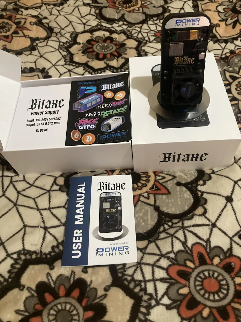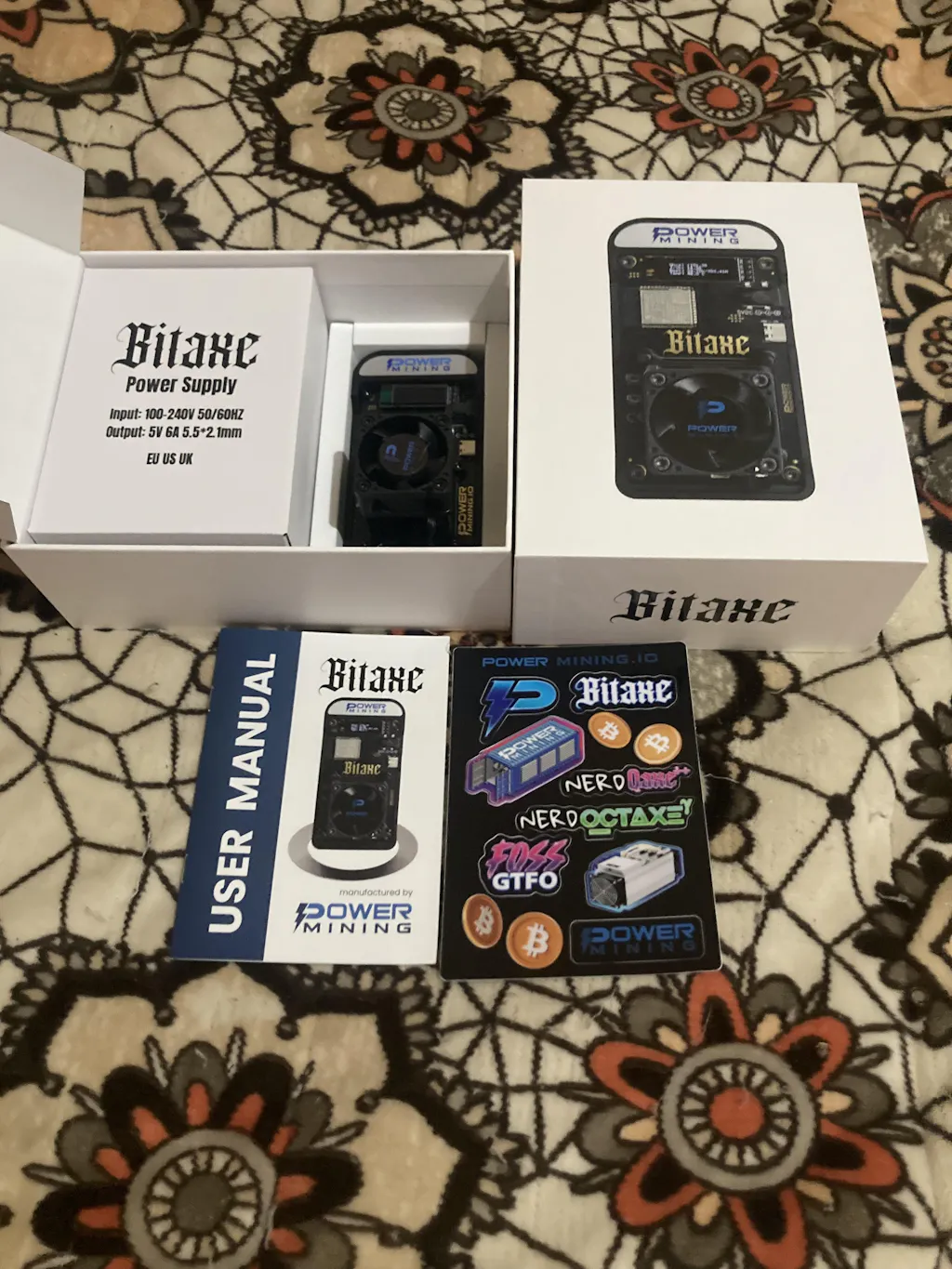 Power Supply: 5V 6A high-quality power supply with Bitaxe logo branding. US / EU / UK or AU plug included