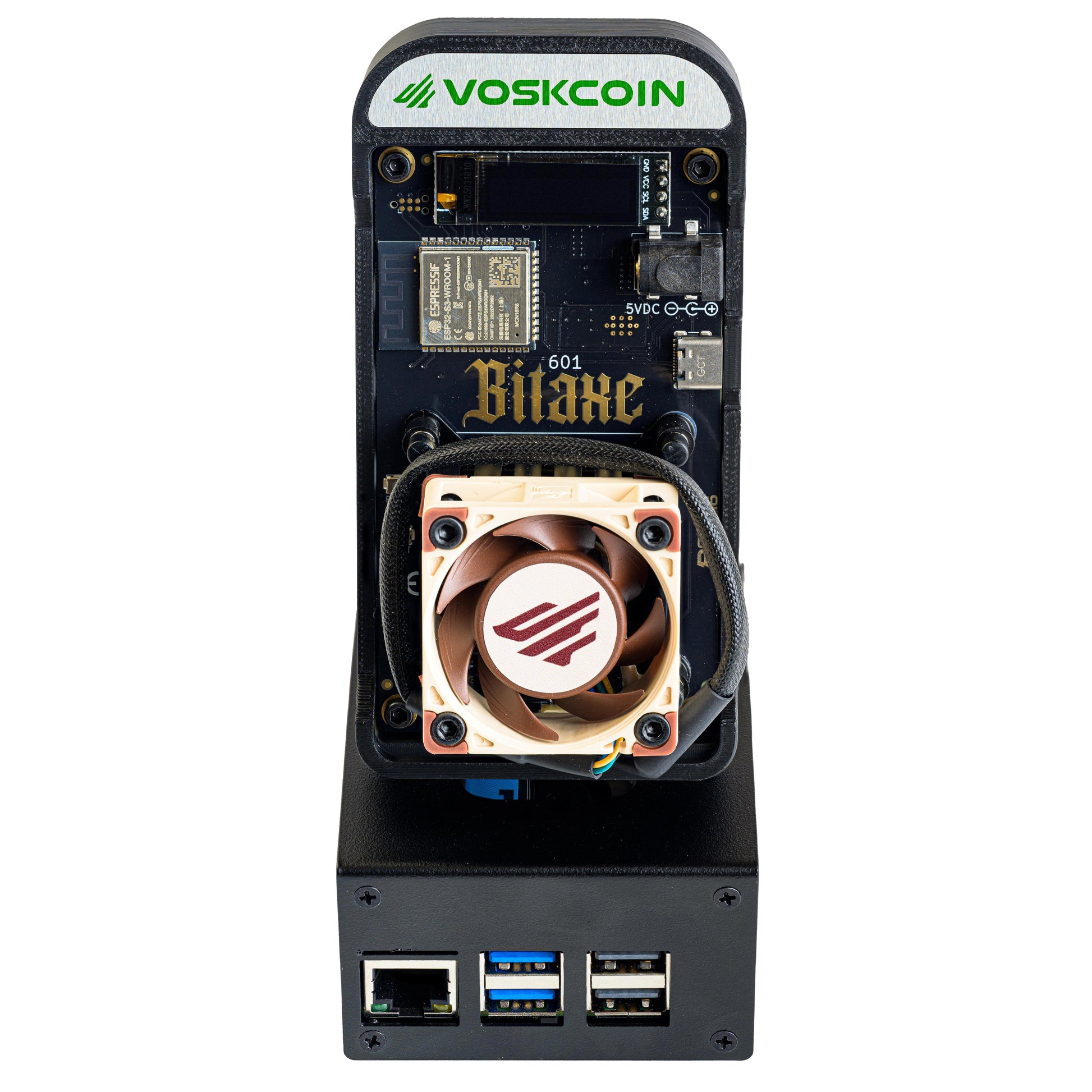 3D-Printed Stand for Bitaxe with stainless steel base and VOSKCOIN faceplate