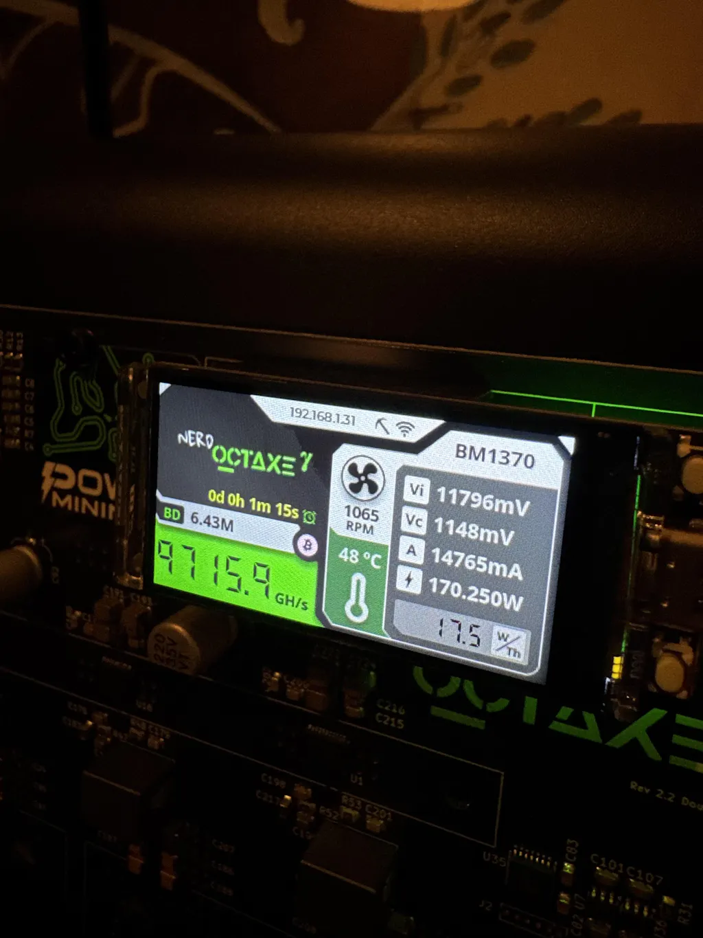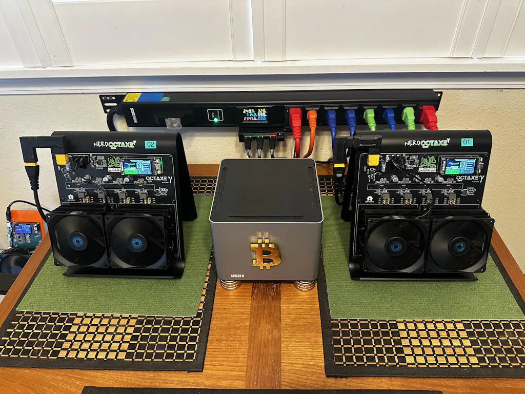 NerdOctaxe Gamma is a 9.6 TH/s 8 chip Bitcoin home miner that consumes ~160 watts.